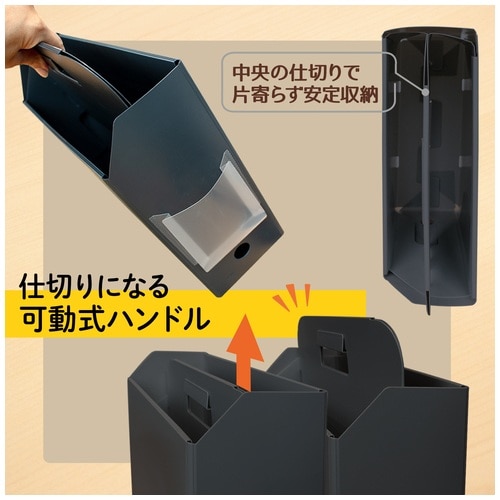 - 水濡れ、汚れから中身を守るPP製の持ち手付きボックスファイル。本体中央に可動式ハンドルを設けることで持ち運びが安定。ハンドルは収納できる。●色:ダークグレー●組立式:組立式●規格:A4-E●仕様:外寸(縦x幅x背幅):263×325×106mm●内寸(縦x幅x背幅):260×315×100mm●材質:ポリプロピレン●注意事項:耐荷重:約4k●本体重量[g]:392