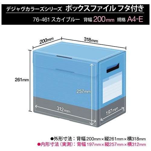- しっかりした強度のフタ付のボックスファイル。、大切な書類をほこりなどから守り、長期保存にも適しています。2段まで重ねて保管できます。●背幅[mm]:200●外形寸法(縦)[mm]:261●外形寸法(横)[mm]:318●内形寸法:縦255×横311×背幅196mm●色:スカイブルー●規格:A4-E●材質:ダンボール●フタ付●デジャヴ ボックスファイル フタ付●本体重量[g]:428