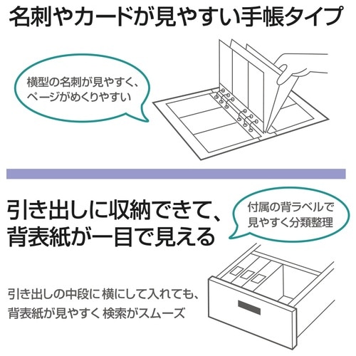 - 差し替えカンタン。増えていく名刺をコンパクトに整理。名刺だけでなく各種カードの整理にも便利です。●外形寸法(縦)[mm]:190●外形寸法(横)[mm]:132●色:ダークグレー●収容枚数[枚]:300●ポケット数:50枚●背幅[mm]:38●穴数[穴]:6●ポケット内形寸法(縦)[mm]:55●ポケット内形寸法(横)[mm]:91●規格:バイブルサイズ●付属品:インデックスシール・背ラベルシール付●材質:表紙=ポリプロピレン0.75mm、ポケット=ポリプロピレン0.07mm●片面ポケット(透明)●ヨコ台紙●タテ入れ●名刺ホルダー<タテ型>●本体重量[g]:192