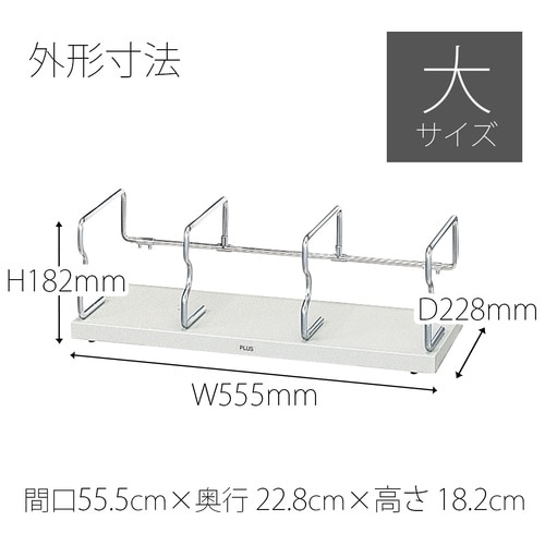 - 便利なスライド式。仕切は自由に動かせる可動式。間口55.5cm●仕切数:2本●外形寸法(幅)[mm]:555●外形寸法(奥)[mm]:228●外形寸法(高)[mm]:182●ゴム足付:有●色:ライトグレー●種別:大●材質:本体=鋼板、パイプ=鋼●仕切棒スライド式●間口55.5cm●本体重量[g]:2800