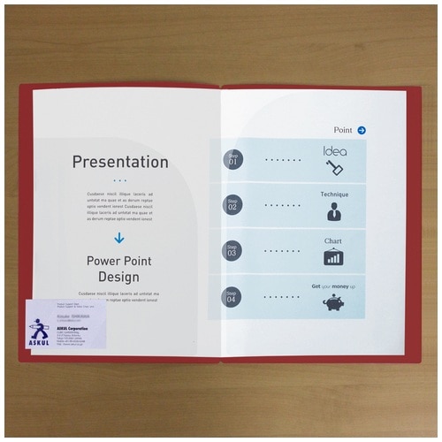 - 2WAYでA3、A4サイズに対応。収納方法で使い道いろいろ。大きな書類もたたんで携帯できるので、プレゼンにも適しています。外側は中身が見えない不透明シート。カードホルダー付き。●外形寸法(縦)[mm]:310●外形寸法(横)[mm]:225●色:レッド●収容枚数[枚]:(片面ポケット10枚)20●規格:A4(見開きA3)●材質:表紙=ポリプロピレン0.5mm、ポケット=ポリプロピレン0.2mm●2WAYホルダー●本体重量[g]:85