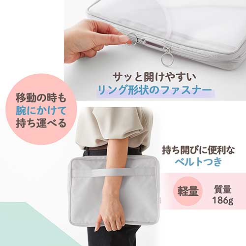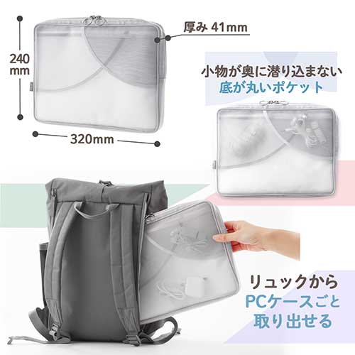- 取り出しやすく収納しやすい!中身を確認しやすいメッシュ素材のPCケース。メッシュで透けて見える小物収納部とクッション付のPC 収納部に分かれています。●外形寸法(幅)[mm]:320●外形寸法(奥)[mm]:41●外形寸法(高)[mm]:240●質量[g]:約186●収納の目安:13インチ●内形寸法:(PC収納ポケット)幅302×奥17×高210mm●色:グレー●材質:本体=ナイロン・ポリエステル、スライダー=金属