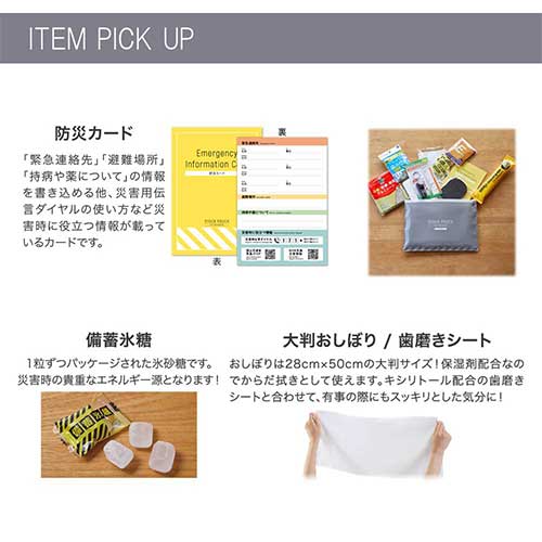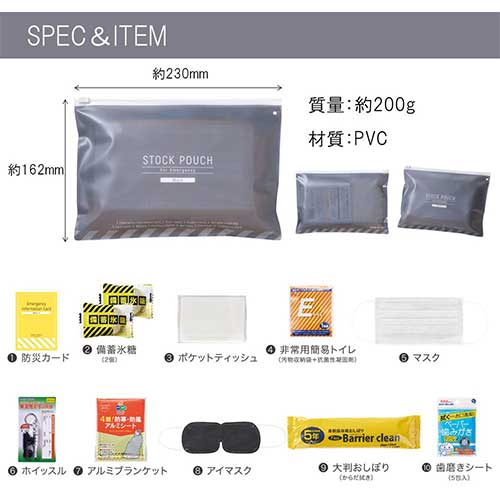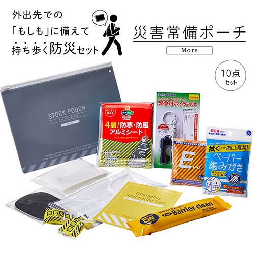 - 電車トラブルによる社内閉じ込め、車の立ち往生、アウトドアのレジャーなど、いつどこで起こるかわからない災害やトラブル。移動中でも、出張中でも、旅行中でも。外出先での「もしも」に備えて持ち歩く防災10点セットです。●セット内容:防災カード、備蓄氷糖×2個、ポケットティシュ、非常用簡易トイレ(汚物処理袋+抗菌性凝固剤)、マスク、ホイッスル、アルミブランケット、アイマスク、大判おしぼり、歯磨きシート●ポーチサイズ(幅×高):約210×148mm●質量:約200g●材質:PVC(ポーチ)
