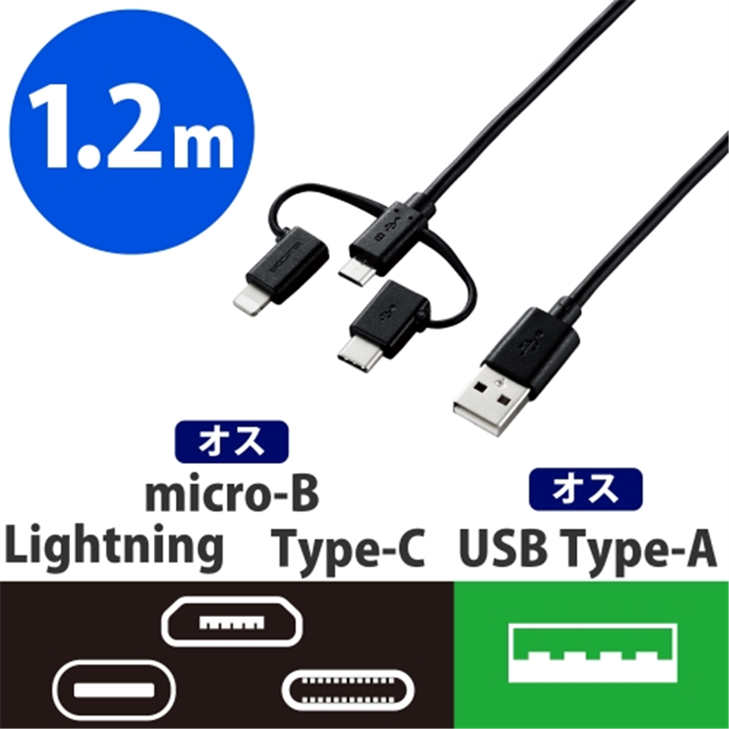 エレコム 3in1ケーブルmicroB/TypeC/Lightning1.2m黒 1個(ご注文単位1個)【直送品】