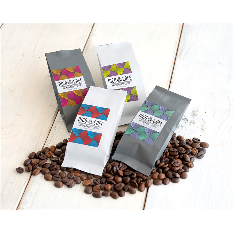 コーヒー粉が約30gが入ります。クラフト紙を貼り合わせた、ガゼットタイプでは1番小さいサイズのかわいい袋です。内側はアルミ蒸着で紫外線をある程度遮断するので、紫外線に弱い食品なども封入できます。飴やチョコ、ラムネなどを入れてプチギフトとしてお使いいただくのにもピッタリです。