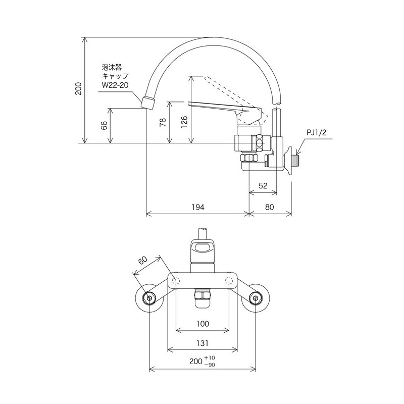 取付ねじ系:PJ1×2×取付ピッチ:110~210×パイプ長さ:170mm