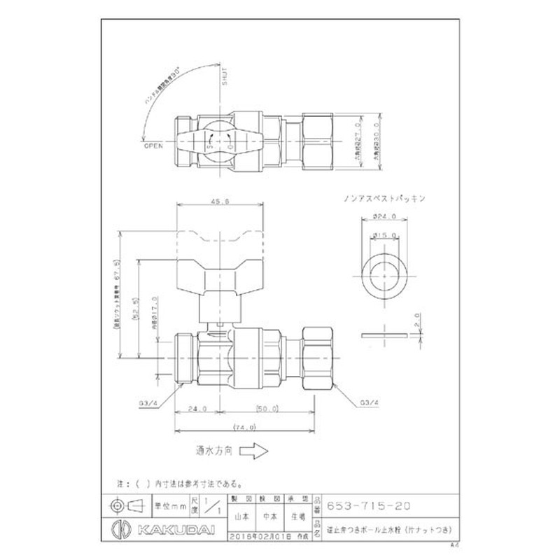カクダイ 2229950 逆止弁つきボール止水栓 #653-715-20 1個(ご注文単位1個)【直送品】