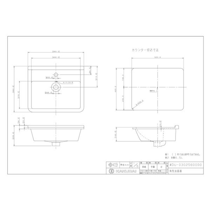カクダイ 2230151 DU-0302560000 角型洗面器 1ホール #DU-0302560000 1個(ご注文単位1個)【直送品】