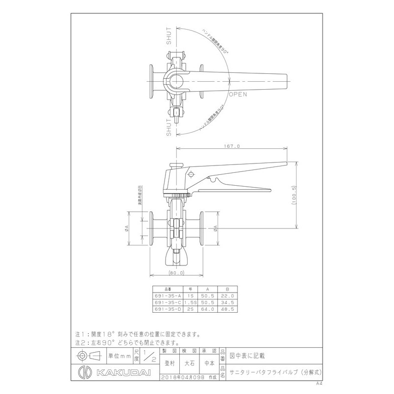 カクダイ 2232040 サニタリーバタフライバルブ 1.5S #691-35-C 1個(ご注文単位1個)【直送品】