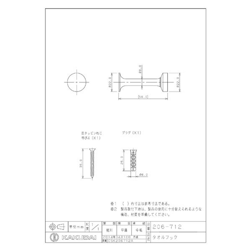 カクダイ 2229176 タオルフック #206-712 1個(ご注文単位1個)【直送品】