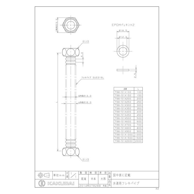 カクダイ 2229003 水道用フレキパイプ/13 #798-51X700 1個(ご注文単位1個)【直送品】