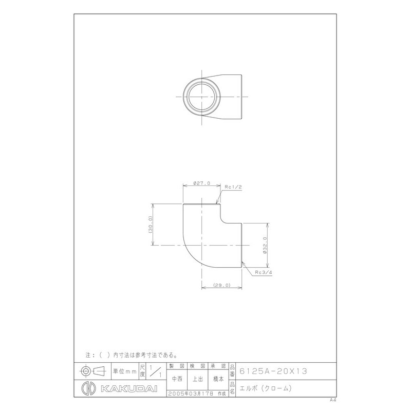 カクダイ 2223016 6125A-20×13 エルボクローム #6125A-20X13 1個(ご注文単位1個)【直送品】
