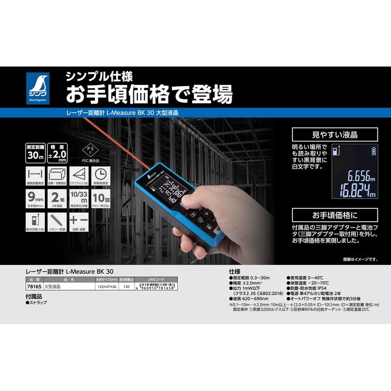シンワ測定 4102790 レーザー距離計 L-MeasureBK30大型液晶 #78165 1個(ご注文単位1個)【直送品】