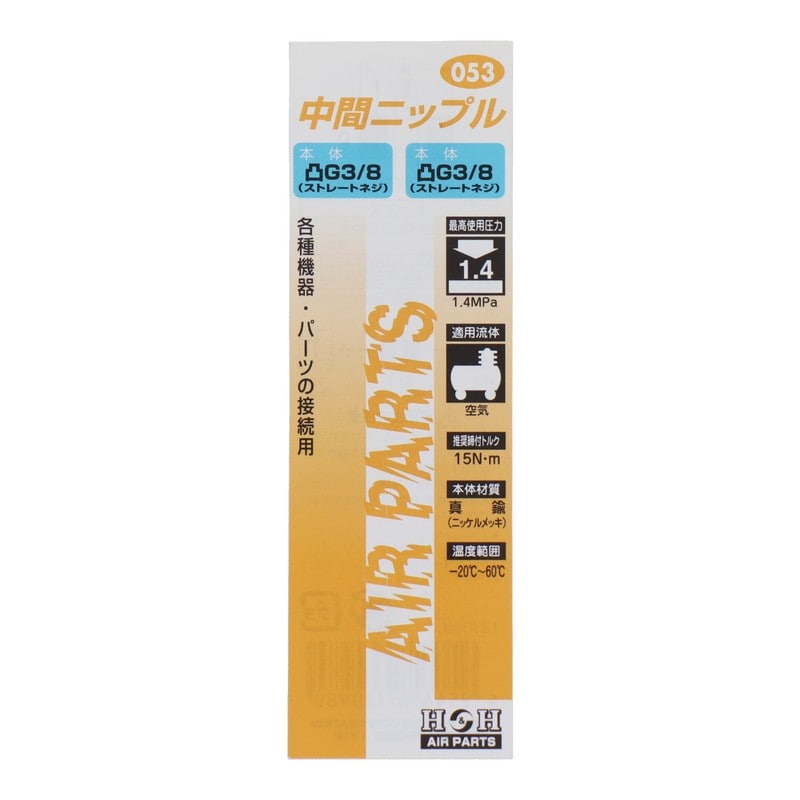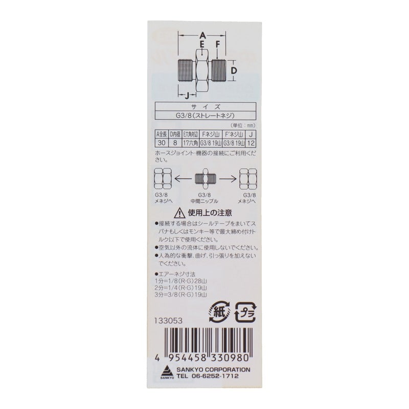 三共コーポレーション 4340583 中間ニップル G3/8×G3/8 #133053 1個(ご注文単位1個)【直送品】