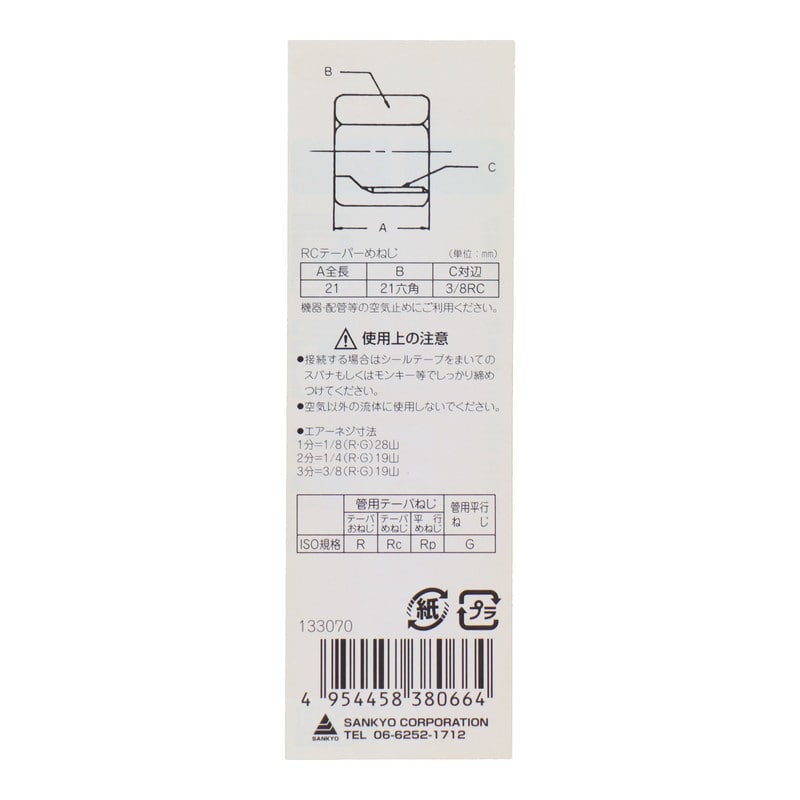 三共コーポレーション 4340586 止めプラグ内ネジ Rc3/8 #133070 1個(ご注文単位1個)【直送品】
