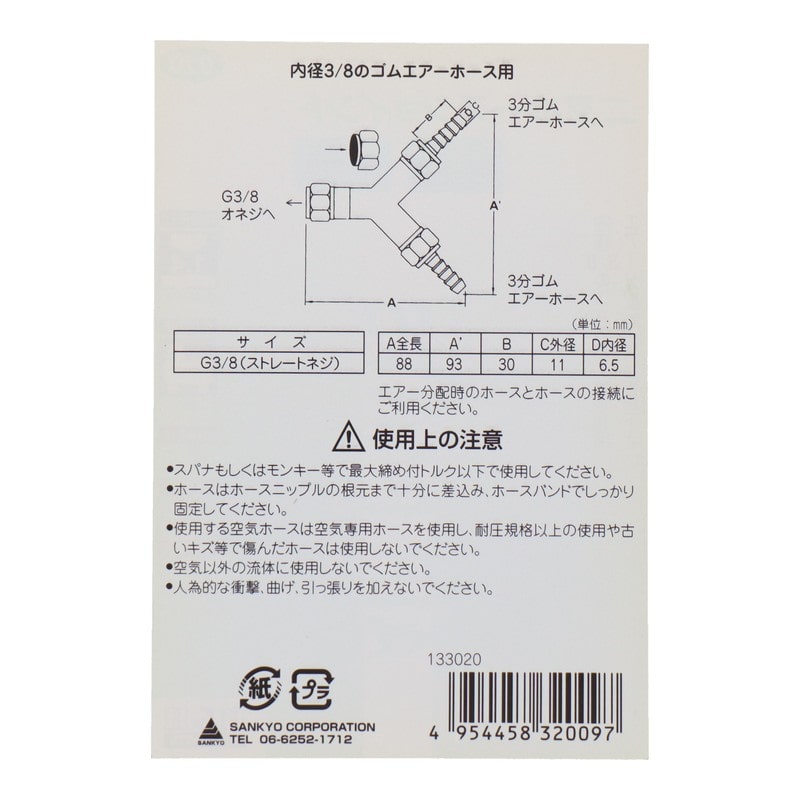 三共コーポレーション 4342685 二又ホースジョイント 11φ×11φ #133020 1個(ご注文単位1個)【直送品】
