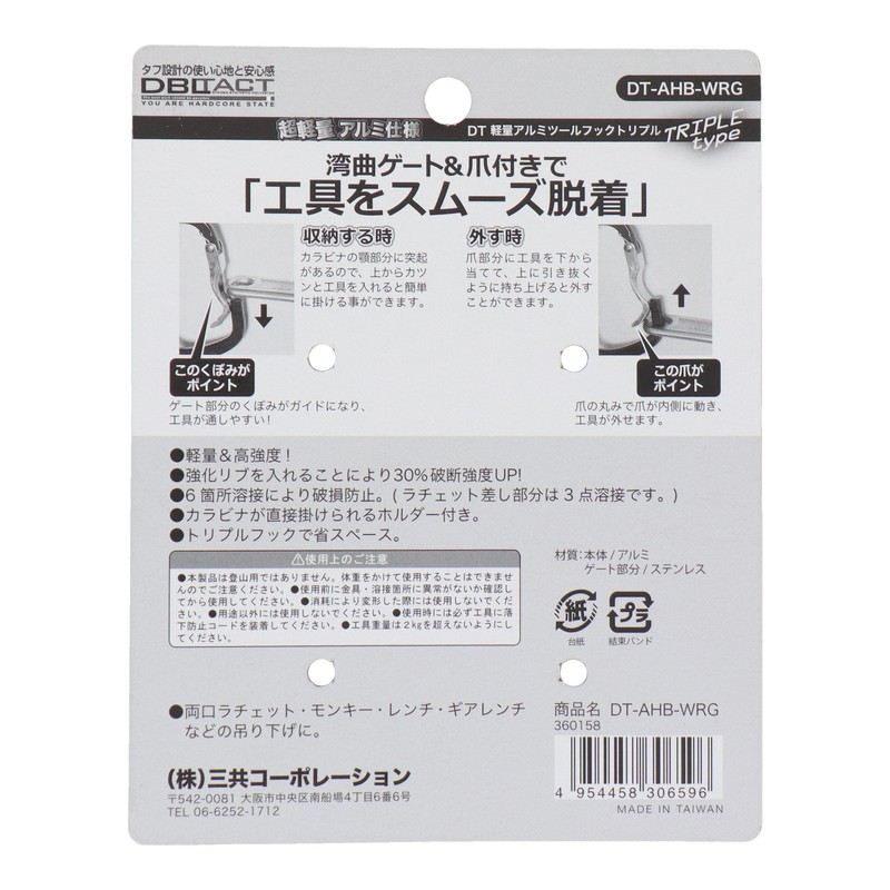 三共コーポレーション 4351923 アルミツールフックトリプル湾曲ゲート×爪付ガンメタ #360158 1個(ご注文単位1個)【直送品】