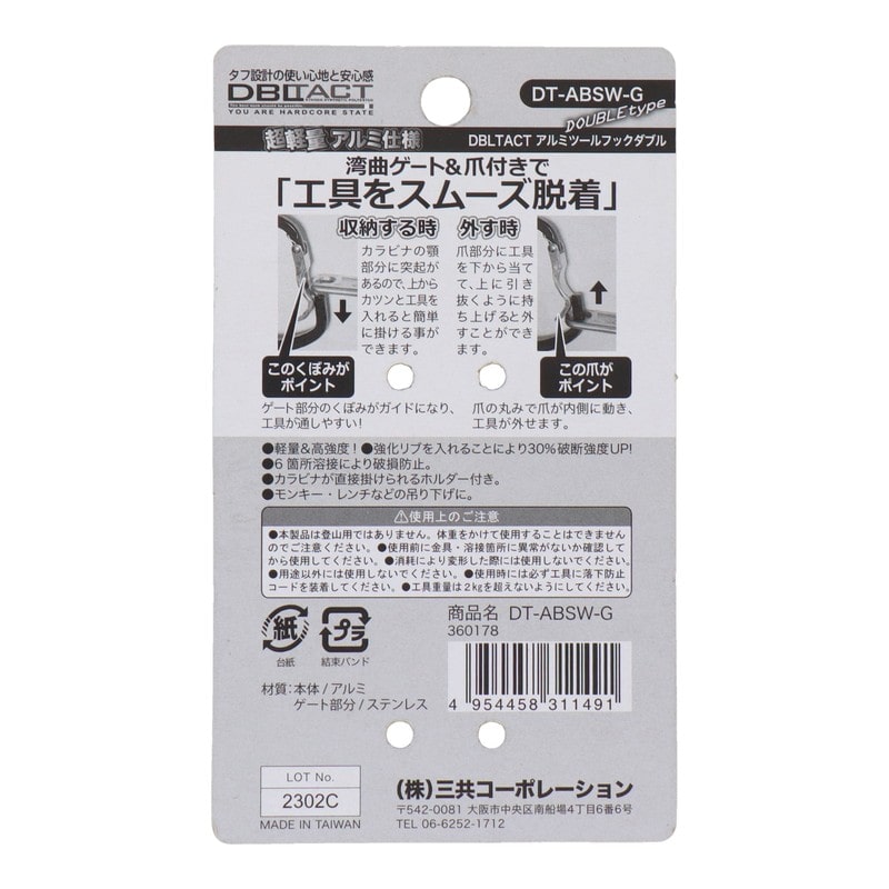 三共コーポレーション 4353360 アルミツールフック湾曲ゲート×爪付きダブルガンメタ DT-ABSW-G 1個(ご注文単位1個)【直送品】