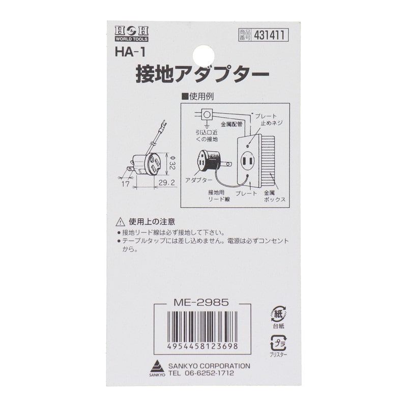三共コーポレーション 4340350 接地アダプター #431411 1個(ご注文単位1個)【直送品】
