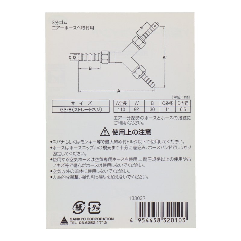 三共コーポレーション 4342686 Y型ホースジョイント 11φ×11φ×11φ #133027 1個(ご注文単位1個)【直送品】