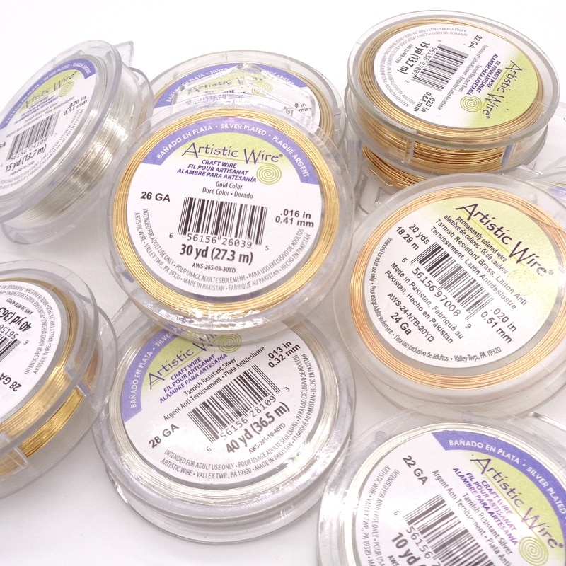 ハンドメイド・ワイヤークラフトの定番、アーティスティックワイヤー!傷に強く耐久性に優れ、ねじったり曲げたりしても折れにくく加工しやすい材質です。色と輝きも劣化しにくく世界中に愛用者の多い、最高級ワイヤーです。天然石のフレーミング、ビーズのメガネ留め、ディップフラワーなど、様々なアクセサリー製作にお使いいただけます。◇サイズ別おすすめ用途28ゲージ(0.32mm):華奢な天然石のメガネ留め(穴小さめ)・ワイヤー編み26ゲージ(0.41mm):小さなビーズや天然石のメガネ留め(穴小さめ)・ワイヤー編み24ゲージ(0.51mm):ビーズやパーツのメガネ留め(穴大きめ)・バイキングニット(ワイヤー編み)22ゲージ(0.64mm):ビーズやパーツのメガネ留め(穴大きめ)・フレーミング・丸カンの製作20ゲージ(0.81mm):天然石のフレーミング・丸カンの製作18ゲージ(1.00mm):雑貨などの芯材・ワイヤーモチーフやティアラのベース・丸カンの製作 ※こちらのカラーは染料のロットによって色味が変わる場合がございます。ワイヤーの個性としてお楽しみください。 サイズ 入数28ゲージ(0.32mm):40ヤード(約36.5m)26ゲージ(0.41mm):30ヤード(約27.3m)24ゲージ(0.51mm):20ヤード(約18.29m)22ゲージ(0.64mm):15ヤード(約13.7m)20ゲージ(0.81mm):15ヤード(約13.7m)18ゲージ(1.00mm):10ヤード(約9.1m) 素材 真鍮線 特長 耐久性に優れ、ねじったり曲げたりしても折れにくく加工しやすい材質です。ノンターニッシュ加工(薄い樹脂のコーティング)が施されており、傷に強く退色しにくくなっております。 ご注意ください ※ロットや太さによって色が変わる場合がございます。※海外製の為、製造時に発生する汚れが付着していたり、傷がある場合がございます。※為替の変動等に伴い価格を変更させていただく場合がございます。※パッケージが変更する場合がございます。 使用用途 ワイヤークラフト全般(メガネ巻き、ワイヤーフレーミング、巻き付け、ワイヤーフラワー等のモチーフ作成 等)
