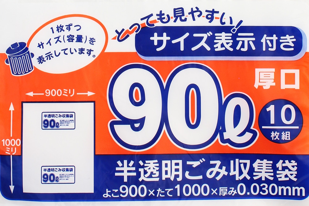 半透明容量表示入りゴミ袋 90L 0.03×900×1000mm (10枚入) 1冊 (ご注文単位1冊)【直送品】