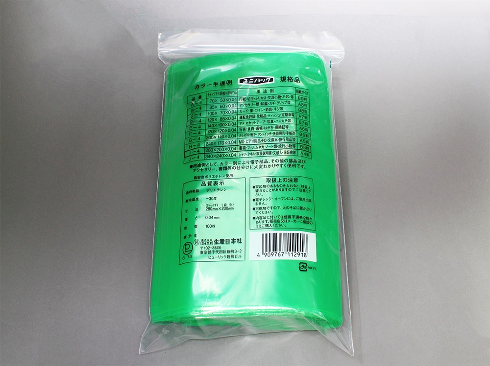 ユニパックカラー半透明 I-4 緑 200×280mm×0.04mm厚 (100枚入) 1個 (ご注文単位1個)【直送品】