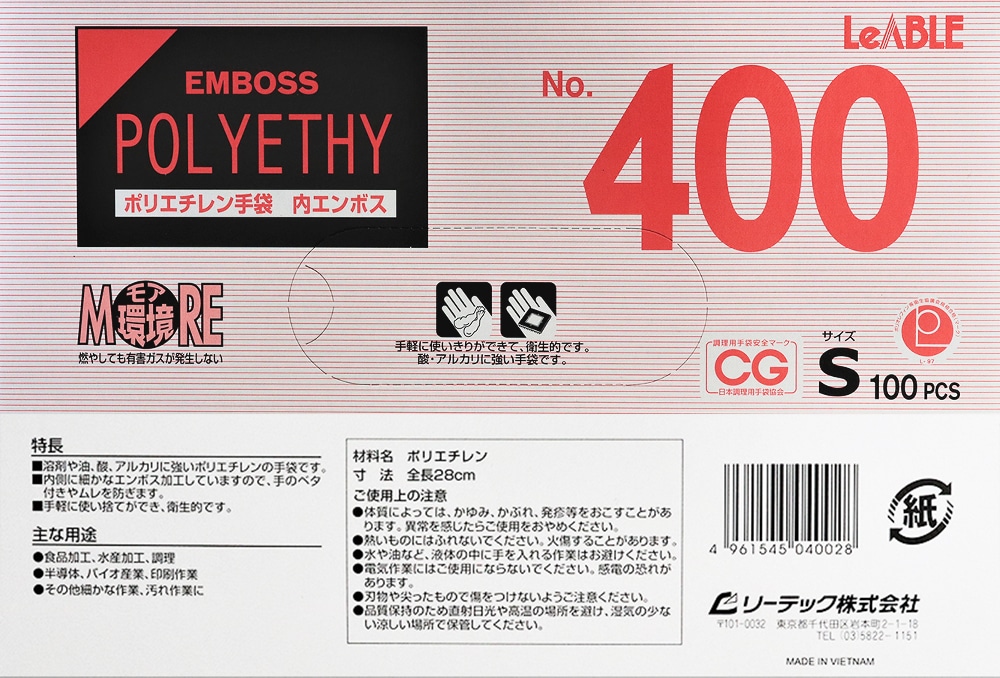 リーブル リーブル ポリエチレン製手袋 No400 S (100枚入) 1箱 (ご注文単位1箱)【直送品】