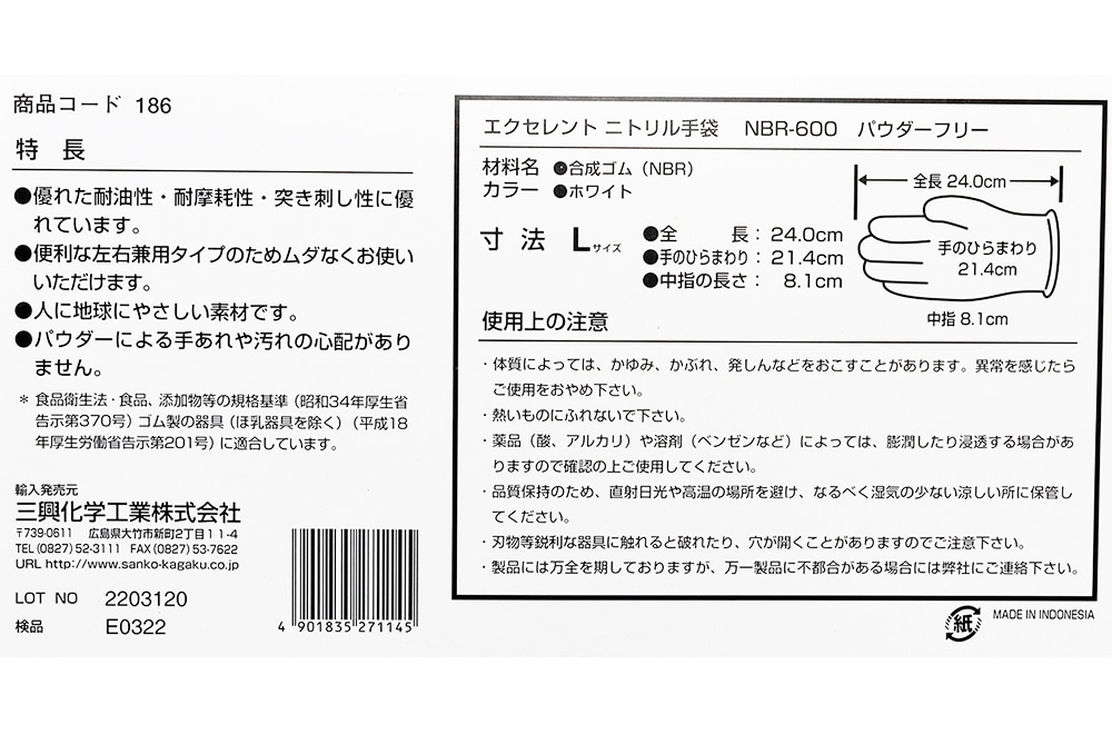 使い捨て手袋 エクセレント ニトリル手袋 NBR-600 L (100枚入) 白 PF 1箱 (ご注文単位1箱)【直送品】