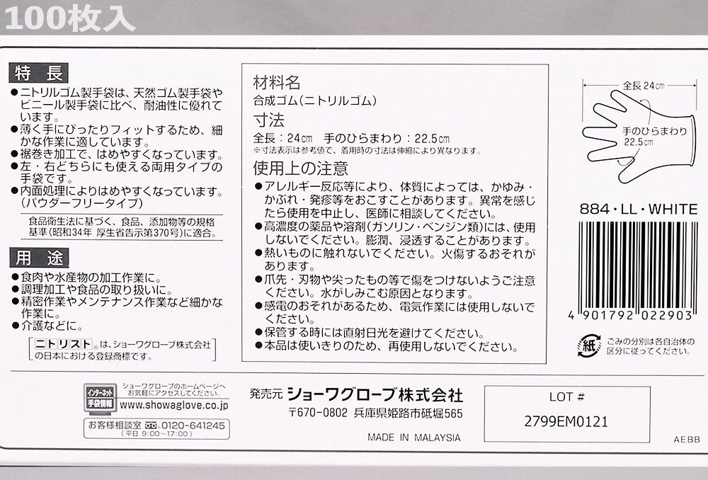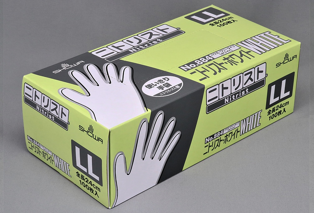 ショーワグローブ ニトリスト・ホワイト手袋 No.884 パウダーフリー LLサイズ 100枚入 1箱 (ご注文単位1箱)【直送品】