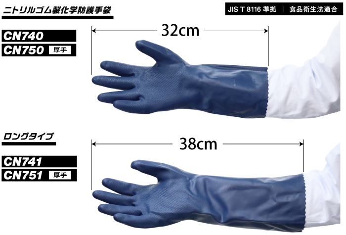 ●食品衛生法適合(化学防護手袋:厚手ロング)【特長】●油・酸性・アルカリ性の薬品の透過を防ぎ、経皮吸収のリスクから作業者を保護します。●JIS T 8116準拠●食品衛生法に適合しています。※食品衛生法に基づく、食品、添加物等の規格基準(昭和34年厚生省告示第370号)に適合。●波型のスベリ止めパターンにより、スベリ止め効果を発揮します。●独自の内面加工により、汗をかいてもベタつきにくくなっています。●ニトリルゴム製のため、油に対して耐久性があり、丈夫です。(裏布なし)※手袋表面に線状の痕や光沢ムラが見える事がありますが、製造工程によるもので性能には問題ありません。【仕様】●材料名:合成ゴム(ニトリルゴム)●色:ブルー●サイズ:M●全長(cm):38●厚み(mm):約0.45●中指の長さ(cm):7.7●掌まわり(cm):21.5●入数(双):1【用途】●油・酸性・アルカリ性の薬品を取り扱う作業に。●食品加工に。