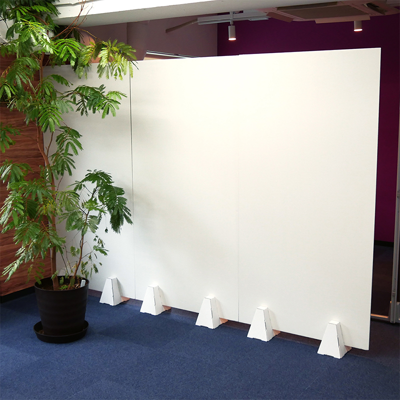 - 両面白色の板ダンボールと自立スタンドがセットになったダンボール製パーテーション。厚さ8mmの頑丈なWフルート素材を使用しています。高さ180cmで、立っている人もしっかり隠せます。設置が簡単で移動もしやすく、使用後は資源ごみとして処分可能で、とても便利です。