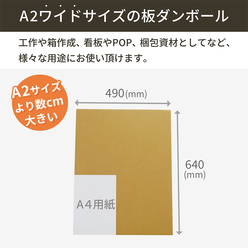 - A2サイズよりひと回り大きい板(シート)ダンボール。一般的な厚さ(5mm)で、工作やアート、梱包の補強や緩衝材、間仕切りなど様々な用途にご利用いただけます。
