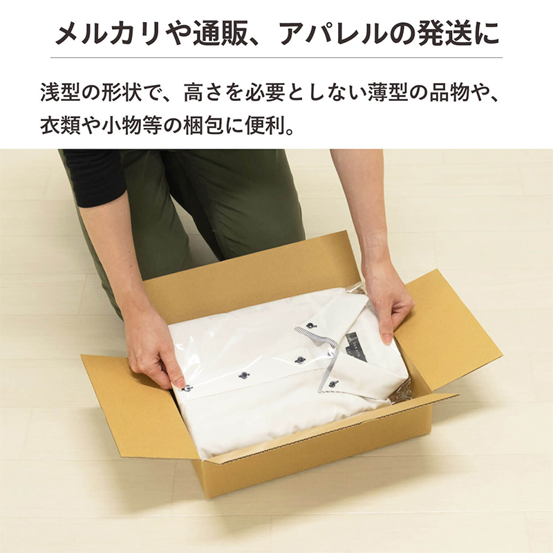 - 宅配80サイズ対応。A4用紙サイズが余裕をもって収納できる、薄型のダンボールです。書類や衣類など様々な浅型荷物の梱包・収納に便利なサイズです。