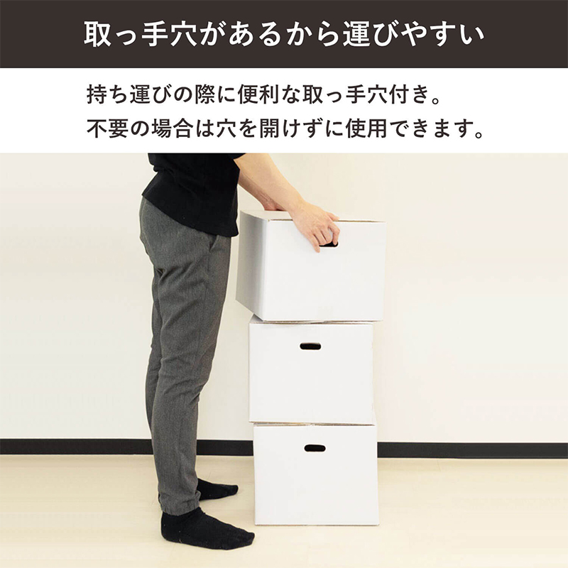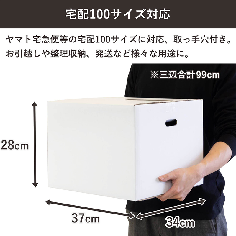 - 宅配100サイズ対応の手穴付き白色ダンボールです。丈夫な材質を使用しているので、書籍や雑誌など重くなりがちな物の整理収納・保管などに最適です。