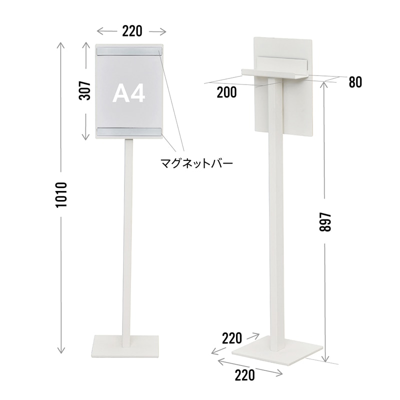 - 消毒液用スタンドと案内板を兼ね備えた商品。消毒液置き有効寸法:W200×D80案内板:A4縦推奨●お客様組立て商品です(2人以上で約15分)●重量:6kg●マグネットバー:スチール(粉体塗装)・マグネット