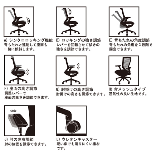 - 背:ポリエステルメッシュ・ナイロン/座:PP・モールドウレタン
