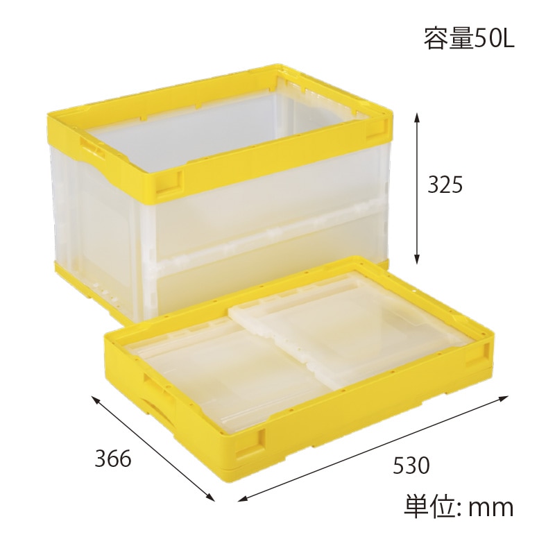 折りコンの長側面口枠(両面)に1色印刷●印刷色:黒もしくは白●蓋なし●容量:50リットル●有効内寸:493×335×305mm●圧縮荷重:6270N●オールプラスチック製●積み重ね可能