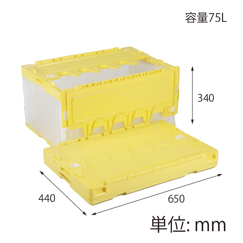 折りコンの長側面口枠(両面)に1色印刷●印刷色:黒もしくは白●蓋付き●容量:75リットル●有効内寸:600×405×307mm●圧縮荷重:10740N●オールプラスチック製●積み重ね可能