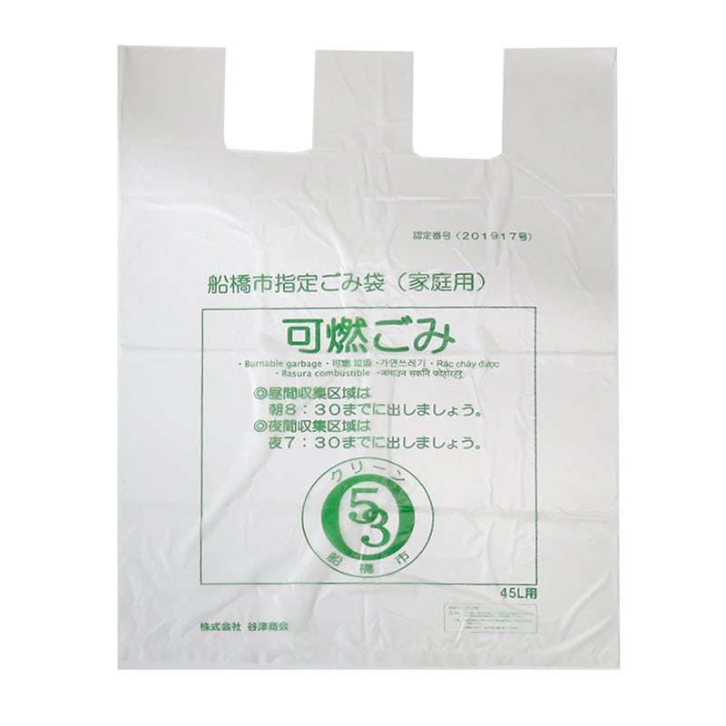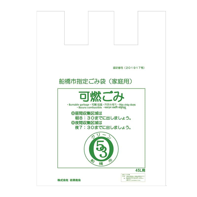 谷津商会 船橋市指定ごみ袋 家庭用 可燃ごみ用 U型袋 45L 50枚入 1束(ご注文単位10束)【直送品】