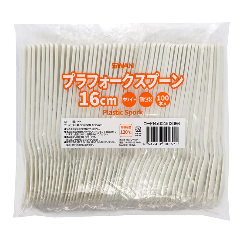 SWAN プラスチックフォークスプーン 16cm 個包装 ホワイト 100本/袋