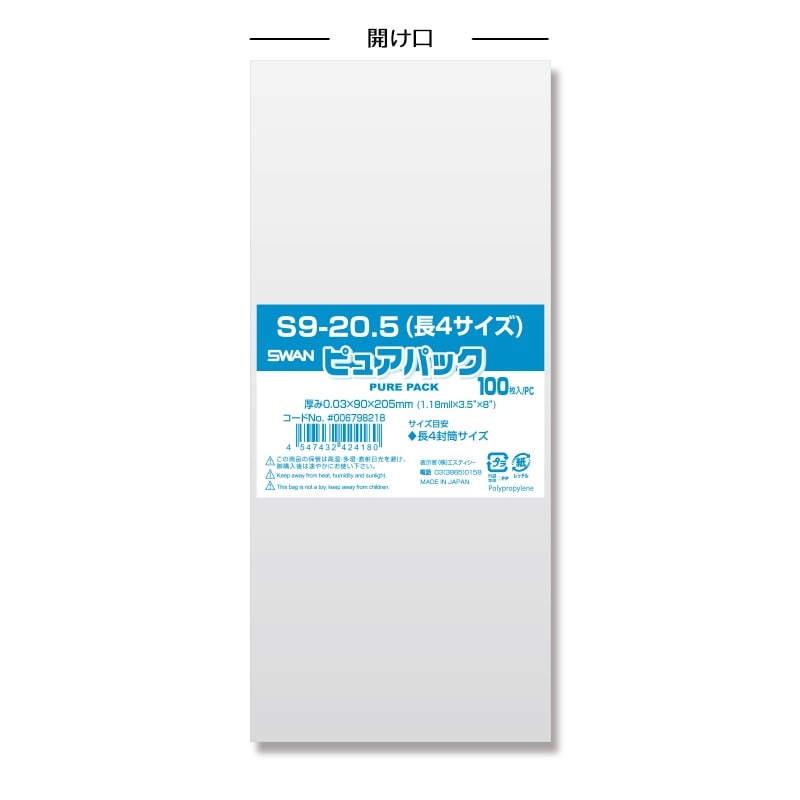 SWAN OPP袋 ピュアパック S9-20.5(長4サイズ) (テープなし) 100枚/袋