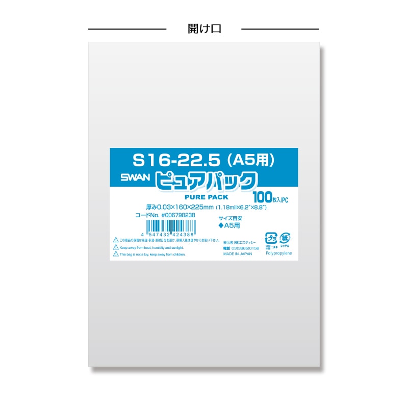 SWAN OPP袋 ピュアパック S16-22.5(A5用) (テープなし) 100枚/袋
