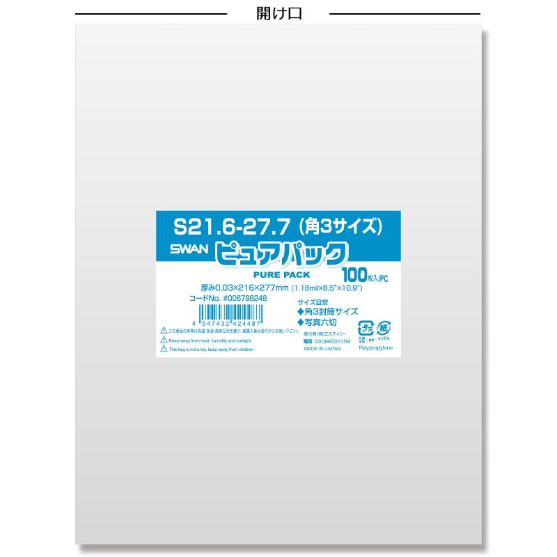 SWAN OPP袋 ピュアパック S21.6-27.7(角3サイズ) (テープなし) 100枚/袋