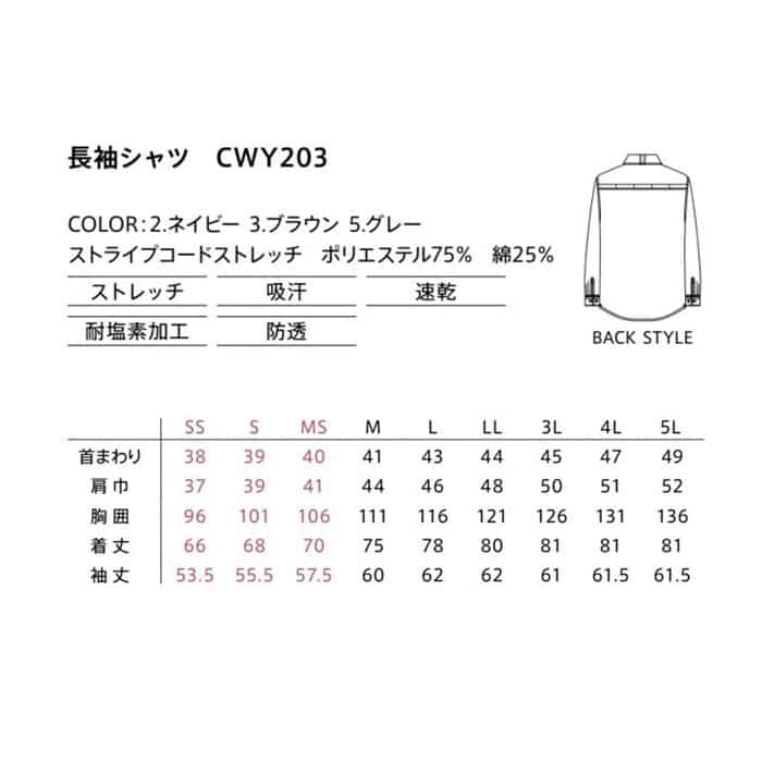 カーシーカシマ ストレッチ長袖シャツ 男女共用 SS グレー CWY203 1枚(ご注文単位1枚)【直送品】