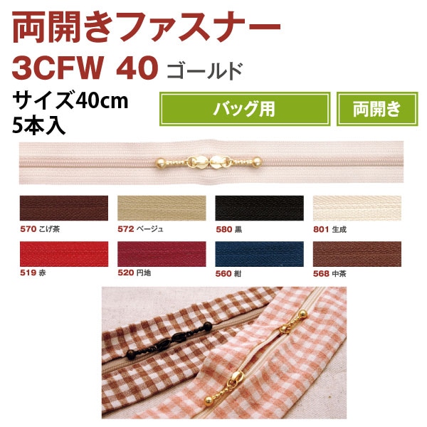日本紐釦貿易 Y.K.K 両開きファスナー 40cm 5本入 赤 3CFW40-519 (ご注文単位1束)【直送品】