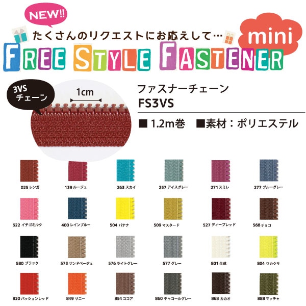 日本紐釦貿易 Y.K.K フリースタイルファスナー ミニサイズ 用 ファスナーチェーン 1.2m巻 FS3VS-257 (ご注文単位1束)【直送品】