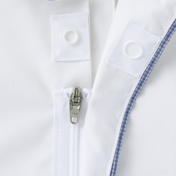 七分袖の男女兼用調理コート。体毛の落下を防止する袖口ネット付き。左袖にペン差しポケット。動きやすさをサポートする背面プリーツ。破損しにくいスナップ・ファスナーで破損による異物落下を防止。襟裏に濃色を配色することで襟裏汚れの目立ちをカバー。