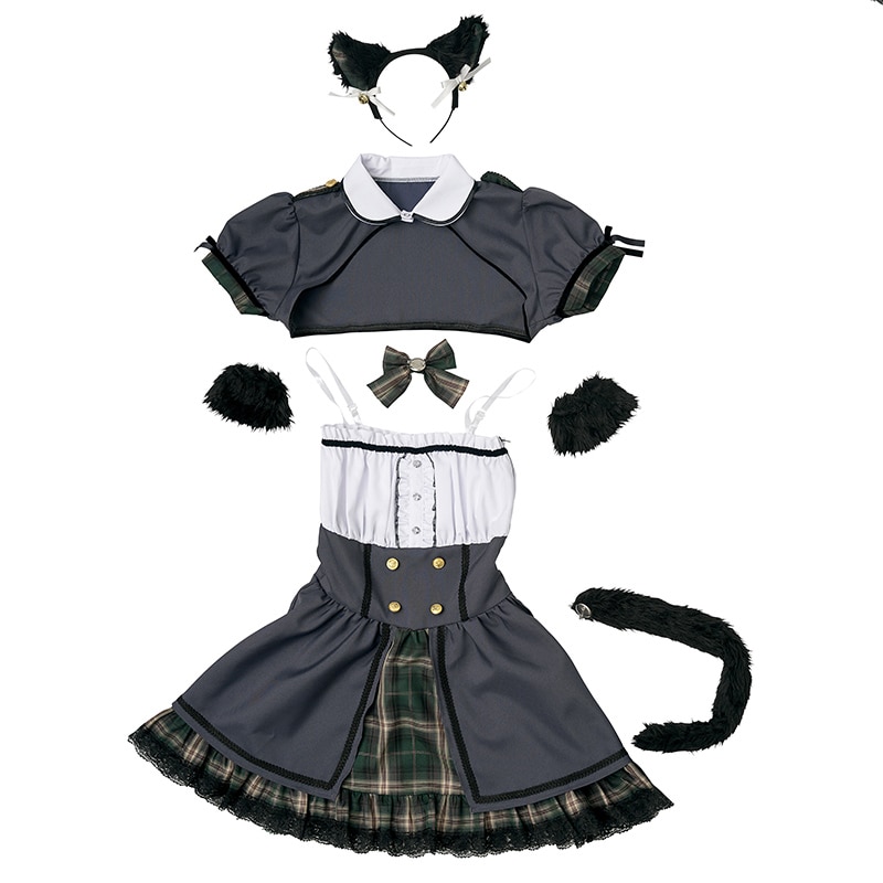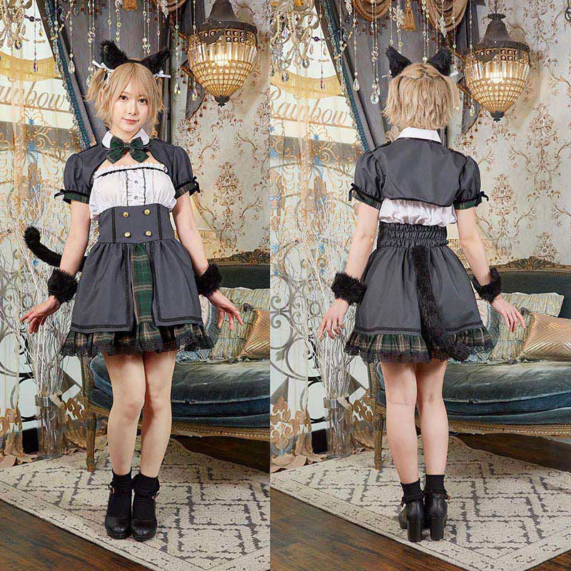 My Fave【=自分の推し】をアピールできちゃう参加型コスチュームシリーズ。PPE所属の人気コスプレイヤーと超豪華コラボ。ネコ派スクールメイドは、ブラトップ型のワンピースに透明ストラップ付きなので長さ調整可能。グリーンベースのチェック柄にグレーと白のカラーリングで制服風の猫型コスチューム。袖口のリボン、裾のレースなど細かい部分もこだわりが満載。しっぽはブローチピン仕様。単品使いもできる優れモノ!ワイヤー入りなので、お好きな形に曲げられます。●セット内容:●セット内容:カチューシャ、ジャケット、ワンピース、リボンブローチ、カフス、しっぽ(ピン付)、透明ストラップ●洗濯表示:洗濯不可、塩素系漂白剤による漂白不可、アイロンは中温で当て布使用、ドライクリーニング不可※汚れは水で薄めた中性洗剤でタオル等を使って拭き取って下さい。●総重量:490g●推奨サイズ:身長155~165cm●モデル身長:152cm●B(実寸):70~106cm●W(実寸):60~86cm●肩幅(実寸):36cm●袖丈(実寸):55cm●モデル名:篠崎こころ●裏地の有無:無し