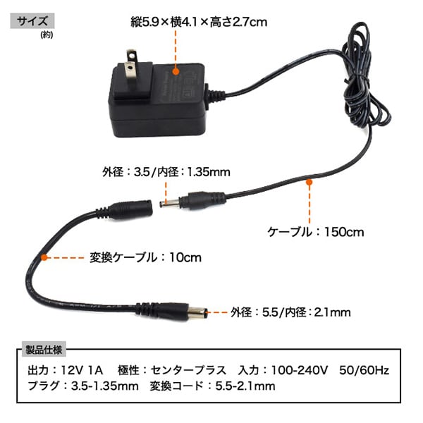 プラタ 12V1A 汎用スイッチングACアダプター 5.5-2.1変換ケーブル付属 ac12v1a55-21 1個(ご注文単位1個)【直送品】